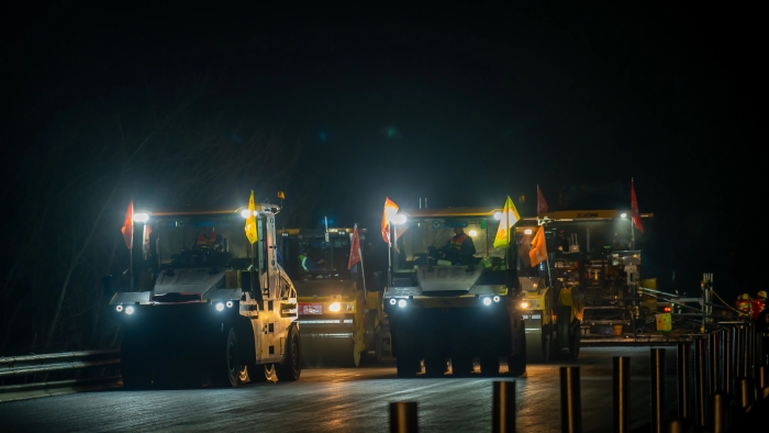 施工現(xiàn)場(chǎng)采用了智能攤鋪碾壓技術(shù),通過(guò)加裝在攤鋪機(jī)、壓路機(jī)上的北斗高精度定位系統(tǒng)、慣性導(dǎo)航系統(tǒng)和可視化等智能技術(shù),實(shí)現(xiàn)了24小時(shí)協(xié)同作業(yè),與傳統(tǒng)路面攤鋪相比,施工效率提高了33%。而且在智能化的加持下,更實(shí)現(xiàn)自動(dòng)變道、自動(dòng)避障,碾壓精度控制在0.5cm。