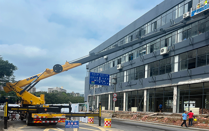 本次施工恰逢傍晚高峰期,時間緊、任務重,且水電路管道安裝需要長時間、高精準的持續性作業,對高空車性能要求較高。為避免占道施工阻礙交通,徐工GKS47高空作業車在街道對面的臨時停車區域快速展車,作業斗搭載3名施工人員和管路材料平穩伸出20余米,橫跨整條街道,直抵商鋪外立面的作業地點,憑借獨有的高精度比例閥驅動控制技術,實現微小流量的精準控制,使工作平臺毫米級的位置調節,便于工作平臺位置精調;柔性制動讓操作更加舒適,能夠精準識別操作員的操作意圖,制動體驗平穩、低沖擊、小晃動,以“微動性、安全性、高效率、大跨距”產品特點完美應對此次施工任務。