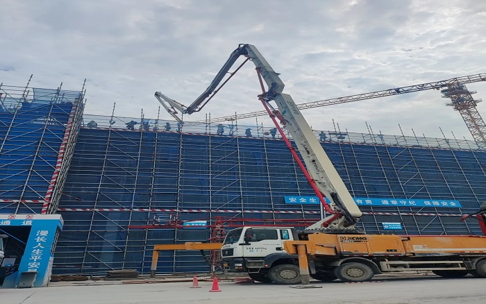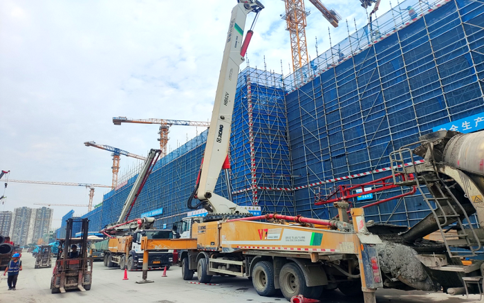 施工現(xiàn)場,臂架林立、機(jī)器運轉(zhuǎn),徐工成套混凝土機(jī)械聯(lián)袂出擊,新能源攪拌車、車載泵、泵車齊上陣,從混凝土運輸、泵送施工、服務(wù)保障等方面守護(hù)項目順利進(jìn)行。