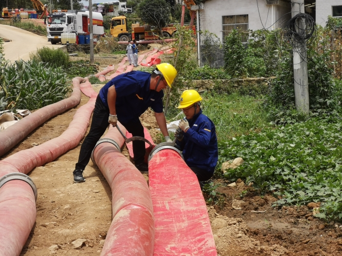 面對嚴峻的救援形勢,7月12日到達現場后,救援隊伍便緊鑼密鼓開始整備,商議排水方案、調試車輛、鋪設水帶、檢查管路……為搶抓救援時間,在制定了嚴謹細致的排水方案后,現場采用“兩班倒”的方式,在近40℃的高溫下24小時不停機作業。