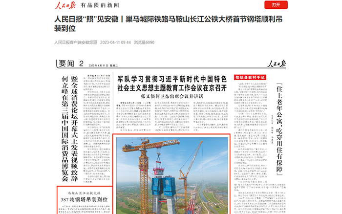 首節(jié)鋼塔吊裝過程獲得《新聞聯(lián)播》《東方時空》《人民日報》《央視新聞》、CCTV4、中國新聞網(wǎng)、新華報業(yè)網(wǎng)、《新民晚報》、安徽網(wǎng)、荊楚網(wǎng)、齊魯網(wǎng)、高鐵網(wǎng)、《馬鞍山日報》等多家央省級主流媒體集中跟進報道,引起廣泛關注。