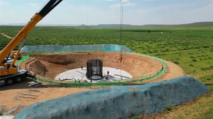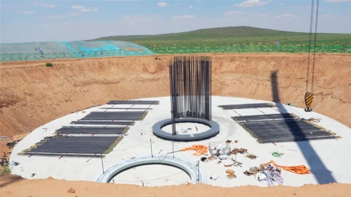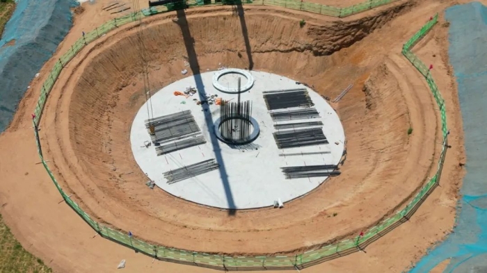 此次進行的是風電基礎吊裝,重達17噸的鉚盤穩落在基坑,214根鉚桿密集插裝,每一根都必須精準插入孔位。