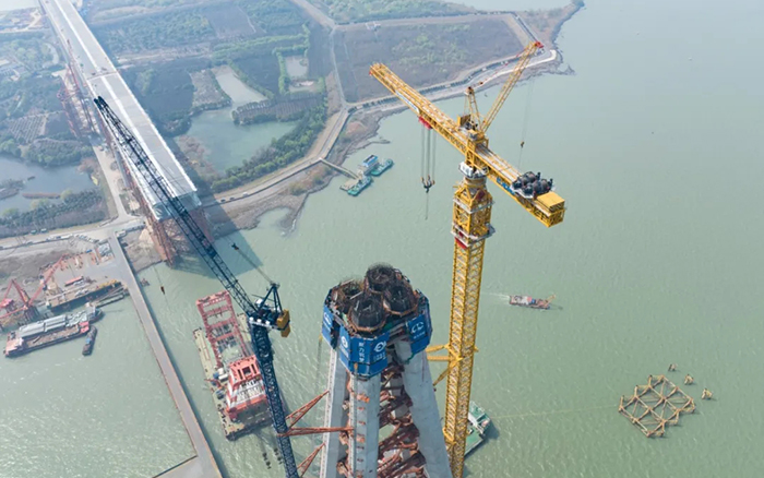 為有力保障常泰長江大橋這一世界級超級工程的建設,徐工與中鐵大橋局聯合研發了全球最大塔機XGT15000-600S,于2022年6月2日成功下線交付。該產品額定起重力矩達15000噸米,最大起升高度400米,最大起重量600噸,可有效解決項目吊裝構件重、施工高度高、作業跨度大等行業施工的“老大難”問題。