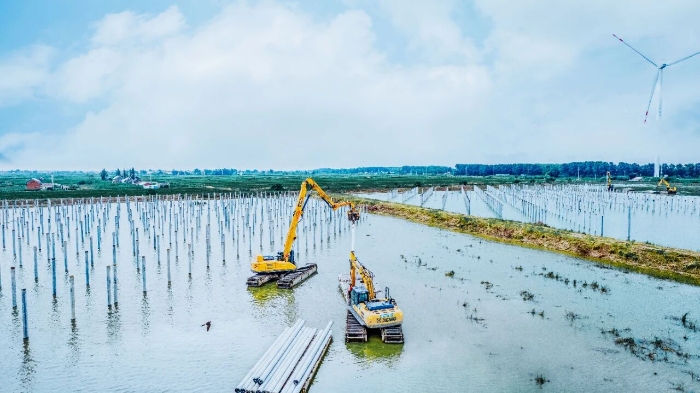 在漁業較為發達的濱海港鎮,“漁光互補”光伏發電項目建設正如火如荼,項目現場,徐工水上打樁機的身影隨處可見。