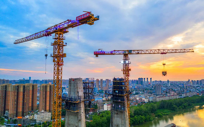近日,數(shù)臺徐工XGT7527A-18S塔機(jī)聳立潁河之畔,百米身姿、直插云端,晚霞映襯下的“徐工金”更加耀眼。
